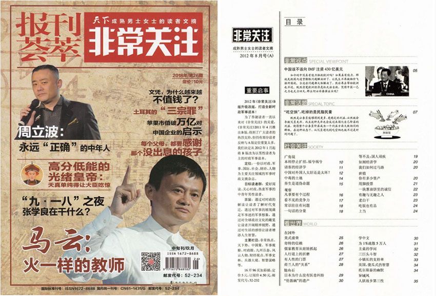 全年一共12期,月刊,單期112頁,彩色銅版紙。出版單位:報(bào)刊薈萃.非常關(guān)注雜志社