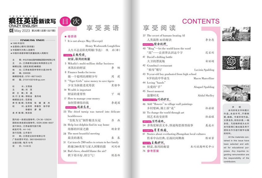 該雜志內(nèi)容豐富,既包括英語學(xué)習(xí)中的基礎(chǔ)知識和技巧,也將提高學(xué)習(xí)者的實(shí)際應(yīng)用能力和文化素養(yǎng)。例如,該雜志會結(jié)合英語課堂的教學(xué)情況,在語法和詞匯方面提供實(shí)用的學(xué)習(xí)技巧,同時(shí)也會提供口語訓(xùn)練、閱讀和寫作舉例,以幫助讀者掌握實(shí)際應(yīng)用技能。