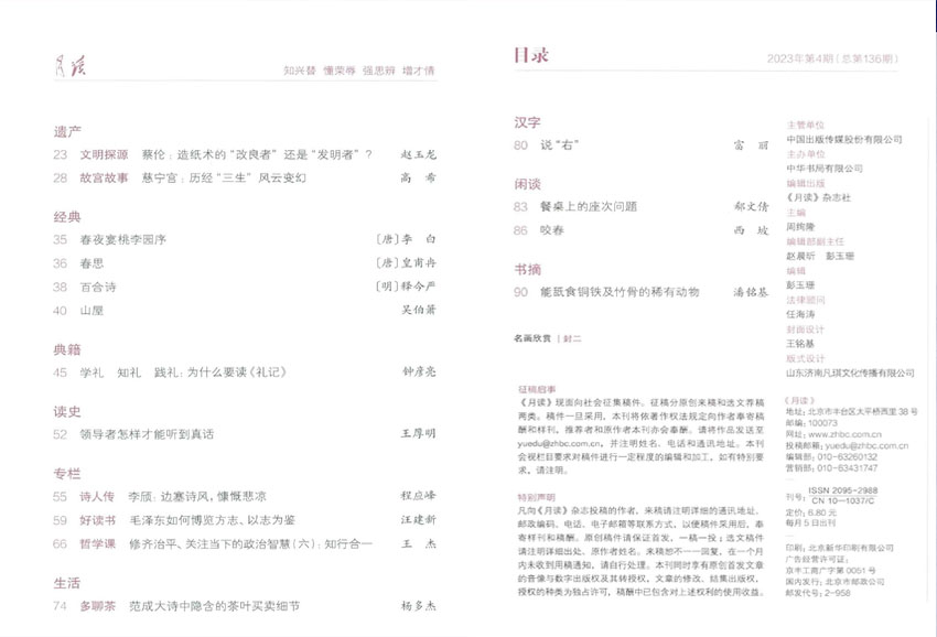 《月讀》主要欄目:中國(guó)象征、特別關(guān)注、鑒古知今、資政通鑒、名句選粹、經(jīng)典名篇、名家論史、跟古人學(xué)哲學(xué)、茶余飯后、隨感札記。
